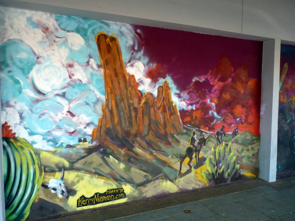 Previous ImageNext Image McDonaldStMuralAngled.McDonaldStMuralAngled Three Riders, aerosol on 8 x 13′ wall, downtown Mesa, March 2016